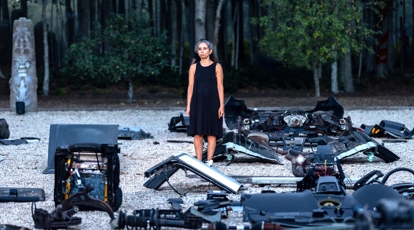 The performance unfolded at the Watermill Center in New York. Around it: guests in cocktail dresses and elegant suits, Aperol spritz in hand, phones raised for photos. The dismantling stretched over two hours. The sun set. People drifted into the trees. By the time the car was nearly gone, only a handful of spectators remained, seated at tables, quietly watching the endgame.