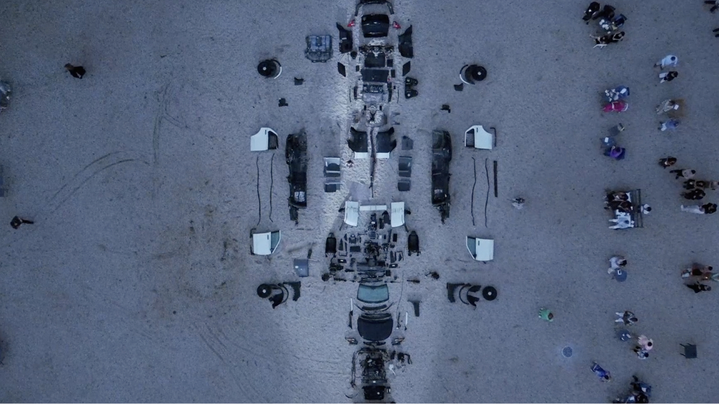What’s written on the side of the car, and how does it play against the idea of dismantling? Which tools do the mechanics use? Are they careful, even gentle — can disassembling feel like ASMR? In the credits, everyone participating in the performance is named except one. Who remains anonymous, and why?