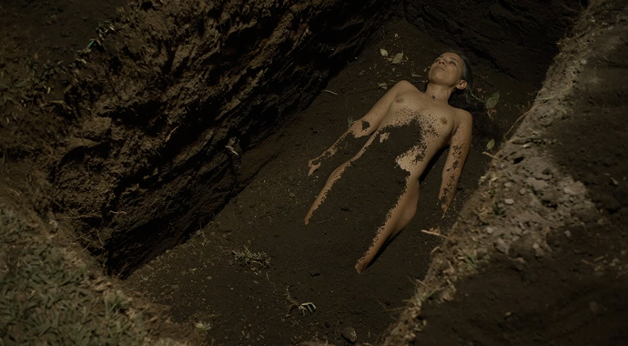 Her works include ¿Quién puede borrar las huellas?, where the artists left bloody footprints through Guatemala City to protest dictator Ríos Montt; La sombra, where a Leopard tank circled her endlessly; and Un metro bajo tierra, in which the audience buried her shovelful by shovelful in a garden, normalizing the spectacle of violence and death.', And there is, of course, SIREN.