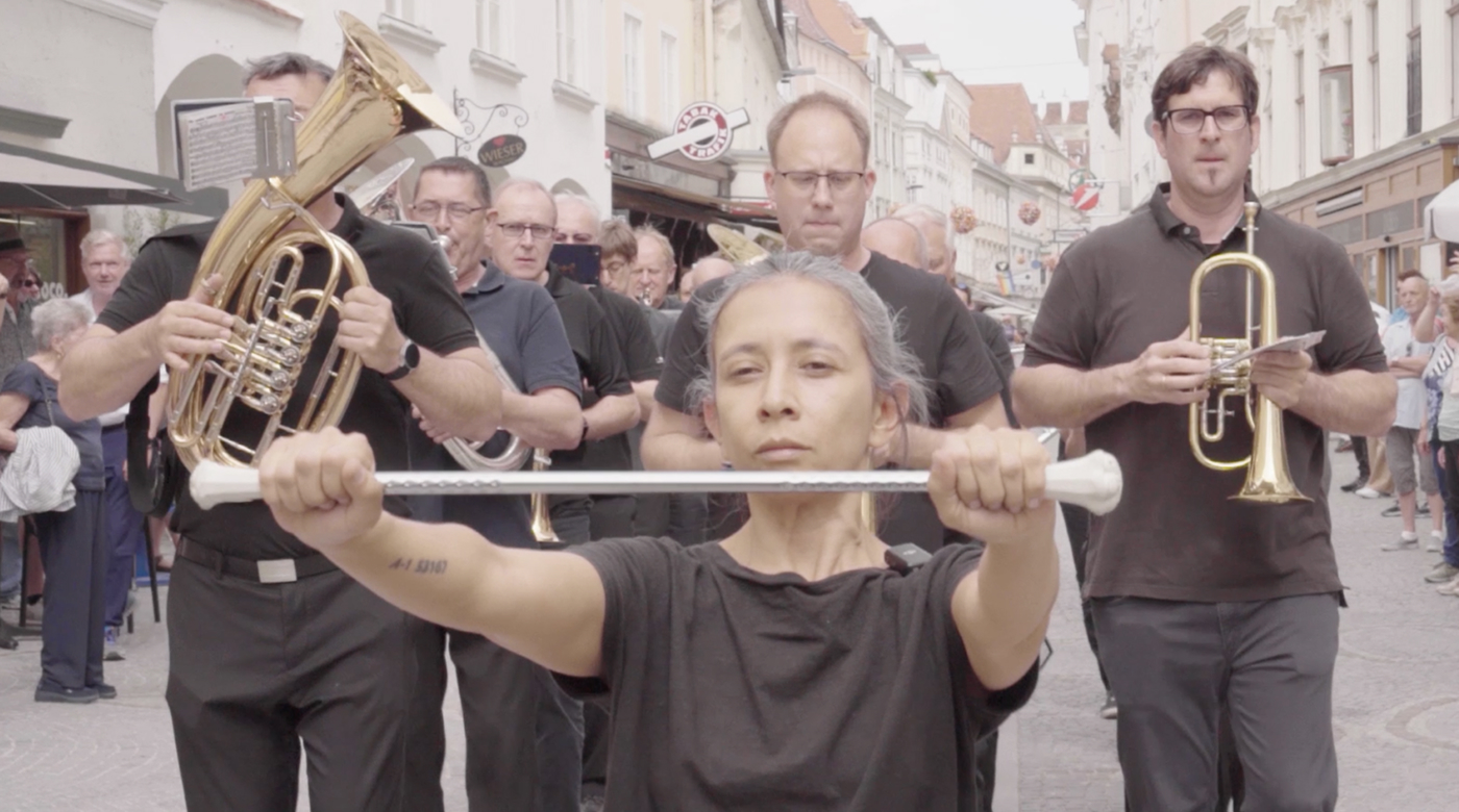 Galindo is Guatemala’s most uncompromising voice in performance art. Her body is her medium: a site where state violence, femicide, and systemic oppression become visible. We met her in Krems an der Donau, where we filmed an interview for CIFRA TV and witnessed her performance El Gran Retorno (the interview coming soon on YouTube — stay tuned). What struck us in person was her presence: calm on the surface, but charged with the same intensity she carries into her actions. On her arm, Galindo carries a tattoo of A-1 53167 — the ID number of fellow Guatemalan artist Aníbal López that he used to sign his actions. López turned everyday logistics into political interventions: scattering coal to block a military parade, dumping books in the street, smuggling empty boxes across borders. Vehicles, streets, borders: not neutral, but tools to disrupt order. Galindo inherits and radicalizes this logic.